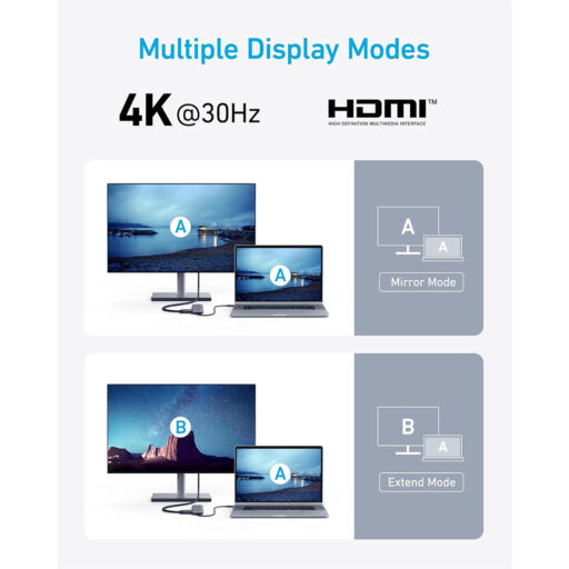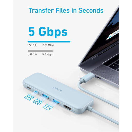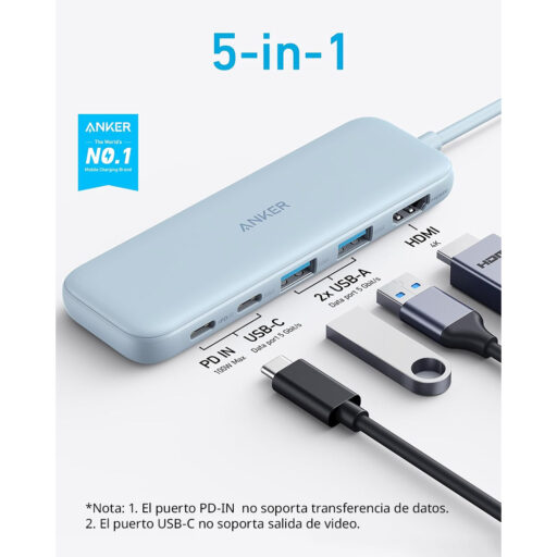 El Anker Hub USB-C 332 (5 en 1) en color azul, modelo A8355011, es una solución versátil para ampliar la conectividad de tu laptop. Con un puerto HDMI que admite resoluciones de hasta 4K a 30 Hz, un puerto de datos USB-C y dos puertos USB-A con velocidades de transferencia de hasta 5 Gbps, este hub te permite conectar múltiples dispositivos y disfrutar de una transmisión de video de alta calidad. Su diseño compacto y ligero facilita su transporte, convirtiéndolo en el compañero ideal para profesionales en movimiento. Además, soporta carga de paso de hasta 85 W, permitiendo cargar tu laptop mientras utilizas el hub (nota: se requiere un cargador adicional no incluido). Compatible con una amplia gama de laptops, incluyendo MacBook Pro, MacBook Air, Dell XPS, Lenovo ThinkPad y HP.