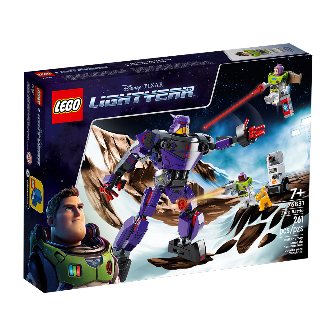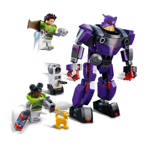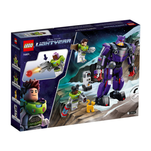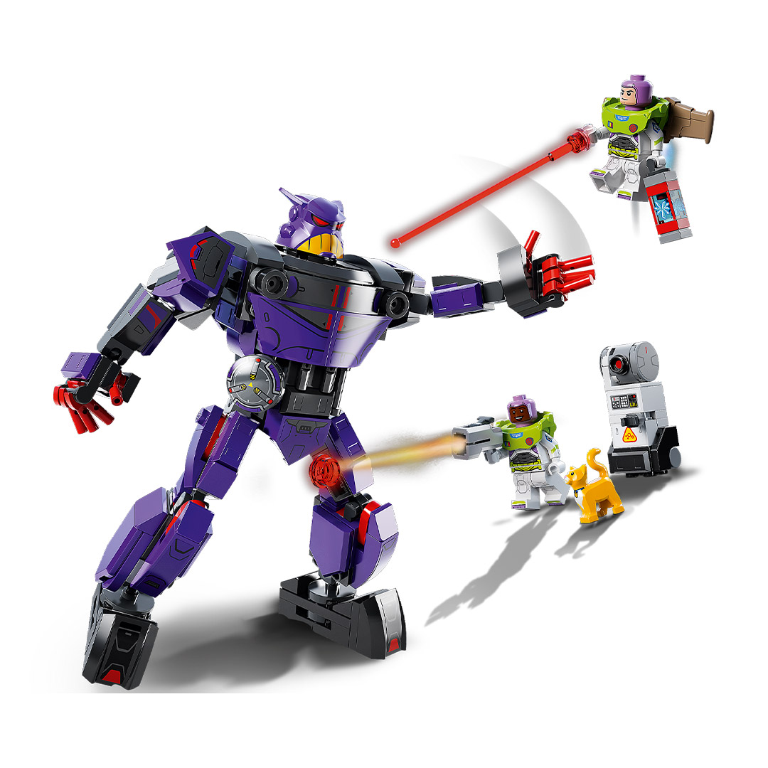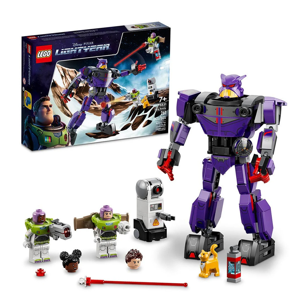 - Personajes de la película: El set Batalla contra Zurg (76831) contiene 2 minifiguras (una de ellas de Buzz Lightyear, el personaje Disney), una figura LEGO® de un gato robótico, un robot construible y un meca articulado