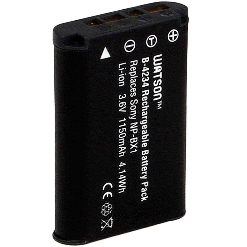 El paquete de baterías de iones de litio Watson NP-BX1 funciona con las mismas cámaras que la Sony NP-BX1. Este paquete de baterías de repuesto tiene una capacidad de 1150 mAh, 3,6 V de potencia de salida y 4,14 vatios-hora. Las baterías de iones de litio, pequeñas y livianas, se pueden cargar o descargar en cualquier momento sin desarrollar el efecto memoria.