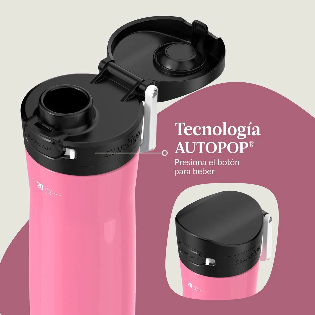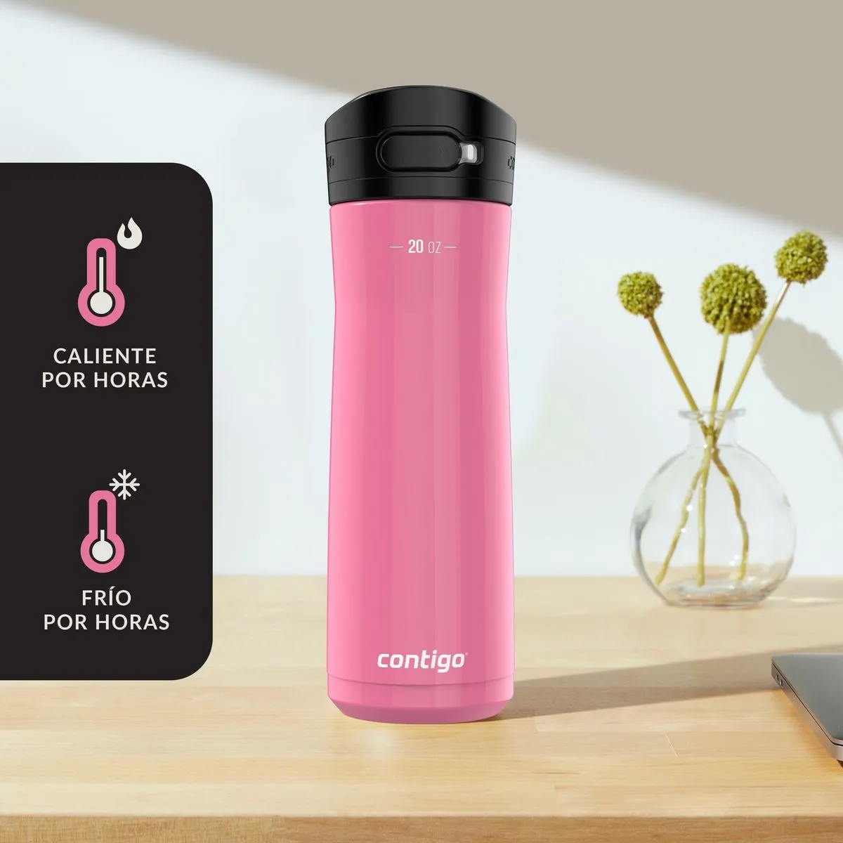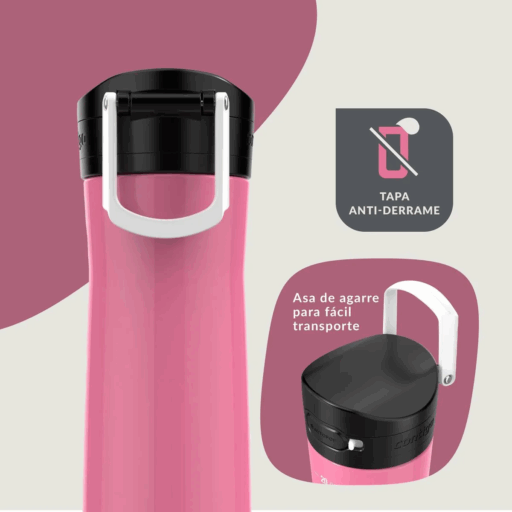 La botella térmica Contigo Jackson Chill 2.0 de 590 ml en color rosa ofrece un diseño práctico y seguro para quienes buscan mantener sus bebidas frías por más tiempo. Fabricada en acero inoxidable con aislamiento al vacío de doble pared, mantiene el frío hasta por 24 horas. Su innovadora tapa AUTOPOP permite beber cómodamente con una sola mano, incorpora un seguro para evitar derrames y mantiene la boquilla protegida del polvo y la suciedad. Incluye un asa integrada para facilitar su transporte, es compatible con portavasos estándar y puede lavarse en la rejilla superior del lavavajillas. Ideal para uso diario en la oficina, el gimnasio o salidas al aire libre. Libre de BPA.