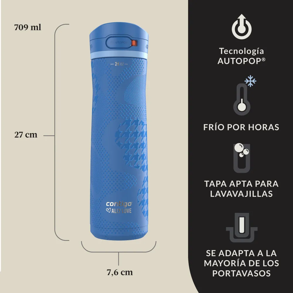 ¡Hola, soy Ally Love! Estoy encantada de presentar la Jackson Chill 2.0, una botella de agua que ayudé a diseñar como Directora de Hidratación de Contigo. Con una boquilla ancha, la Jackson Chill 2.0 te permite beber fácilmente con una sola mano, ya sea que estés haciendo ejercicio o trabajando en tu escritorio. Su cuerpo de acero inoxidable de doble pared con aislamiento al vacío mantiene tu bebida fría durante 24 horas, para que te mantengas fresco durante tu ajetreo diario. También es fácil de llevar gracias a un asa integrada, y no tienes que preocuparte por derrames en tu bolsa de gimnasio, bolsa de trabajo, bolso o portavasos del coche: simplemente cierra la tapa entre usos y luego bloquéala para mayor protección. La tapa es apta para lavavajillas en la rejilla superior y el cuerpo es lavable a mano. ¡Aquí está para mantenerte hidratado y con estilo!
