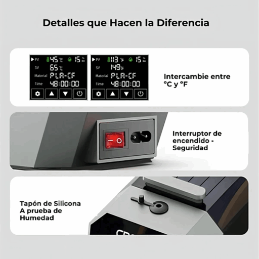 El Secador de Filamento Creality Space Pi agiliza la selección de filamentos y optimiza el proceso de secado. Con una temperatura ajustable entre 45? y 70?, monitoreo en tiempo real de humedad y temperatura, y la capacidad de configurar el tiempo de secado hasta 48 horas, este dispositivo asegura condiciones ideales para tu filamento. Además, su sistema de calentamiento de aire de 360° y la posibilidad de configurar un solo botón para 12 tipos de filamentos lo convierten en una herramienta esencial para tus necesidades de impresión 3D.