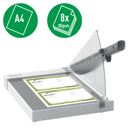 La guillotina de papel Leitz Precision Home A4 es perfecta para el hogar, las manualidades y para hobbies para cortar papel, etiquetas, películas, fotos, hojas plastificadas y tarjetas. Esta cortadora de papel doméstica, ligera y compacta, recorta sin esfuerzo hasta 8 hojas de papel A4 de 80 grs. con rapidez y precisión. La abrazadera de papel manual y transparente te permite ver la línea de corte de la cuchilla para obtener una precisión total en todo momento, mientras que el mango ergonómico garantiza un corte cómodo y fácil. Es rápido y fácil alinear el papel con las sencillas líneas de la cuadrícula métrica, las guías de ángulos y las reglas de medición en la superficie de trabajo lisa y plastificada. El seguro de la hoja de corte ofrece una protección total y el pestillo de seguridad mantiene la hoja de corte bloqueada mientras no se utiliza.