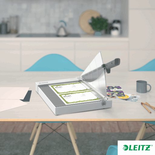- Guillotina de papel, ligera y compacta, ideal para el corte preciso de pilas de papel más grandes y materiales más gruesos como tarjetas y cartulina.