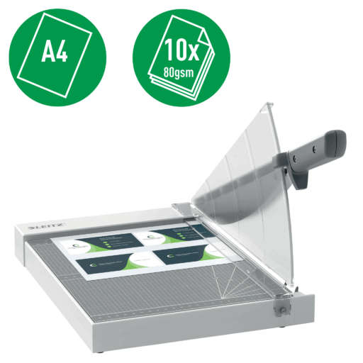La guillotina de papel Leitz Precision Home Office A4 es perfecta para su uso en casa y en la oficina para cortar papel, etiquetas, películas, fotos, hojas plastificadas y tarjetas. Esta resistente y ligera cortadora de papel doméstica cortará sin esfuerzo hasta 10 hojas de papel A4 de 80 grs. con rapidez y precisión. Cuenta con la exclusiva tecnología de luz EdgeGlow que ilumina el filo de corte para una mayor visibilidad y máxima precisión. La abrazadera de papel manual y transparente mantiene el papel seguro, mientras que el mango ergonómico garantiza un corte cómodo y fácil. Es rápido y fácil alinear el papel con las sencillas líneas de la cuadrícula métrica, las guías de ángulos y las reglas de medición en la superficie de trabajo lisa y plastificada. El seguro de la hoja de corte ofrece una protección total y el pestillo de seguridad mantiene la hoja de corte bloqueada mientras no se utiliza. Con una cuchilla de acero inoxidable de alta calidad, una superficie de trabajo resistente y una garantía ampliada de 3 años, tendrás la tranquilidad de que esta guillotina de papel te proporcionará un corte preciso durante muchos años.