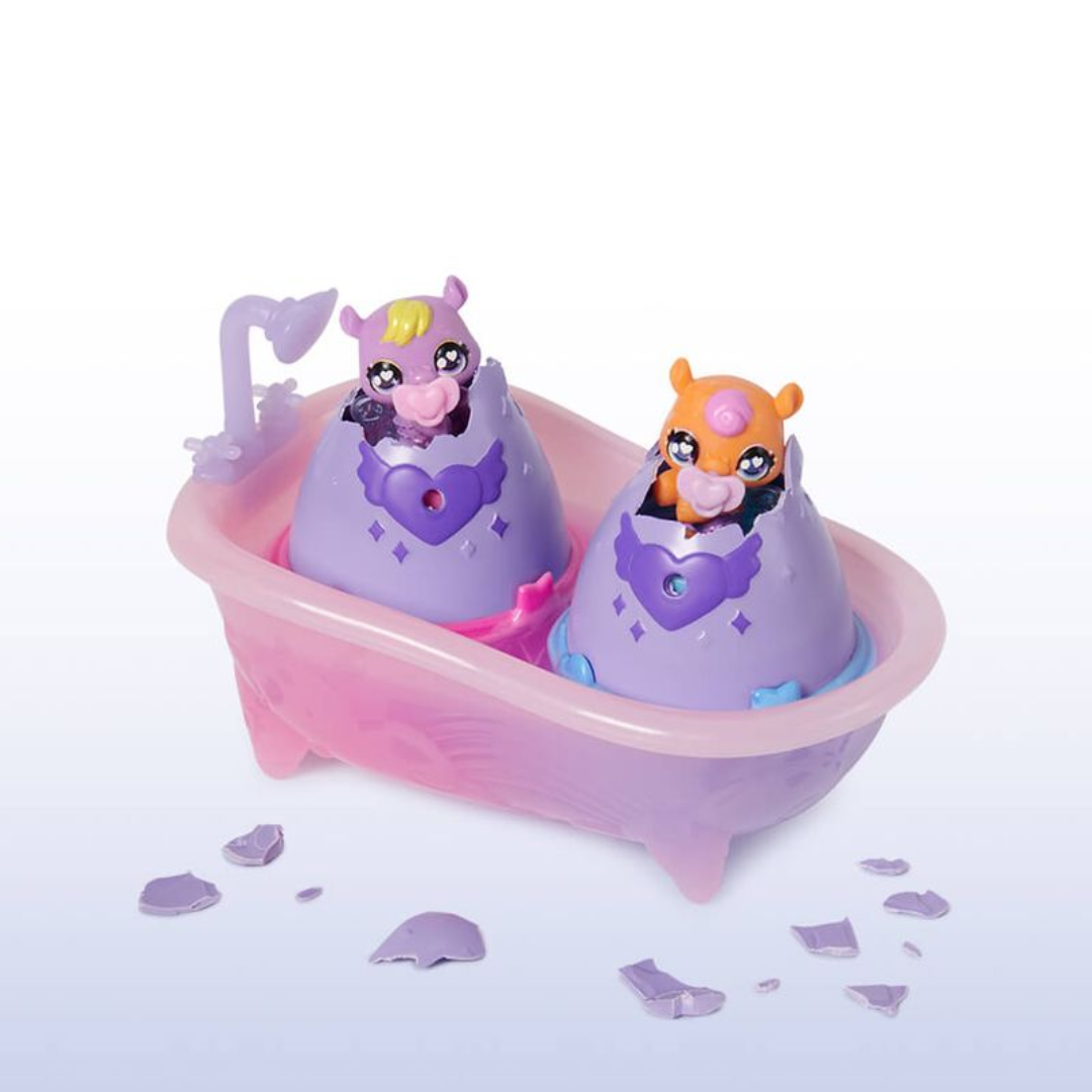 Convierte la hora del baño en una experiencia mágica con Hatchimals Diversión Baño de Colores. Solo agrega agua y observa cómo los huevos giran, burbujean y se abren para revelar hipopótamos gemelos que cambian de color con la temperatura. Con múltiples accesorios incluidos, este set sensorial estimula la imaginación y garantiza diversión en cada eclosión.