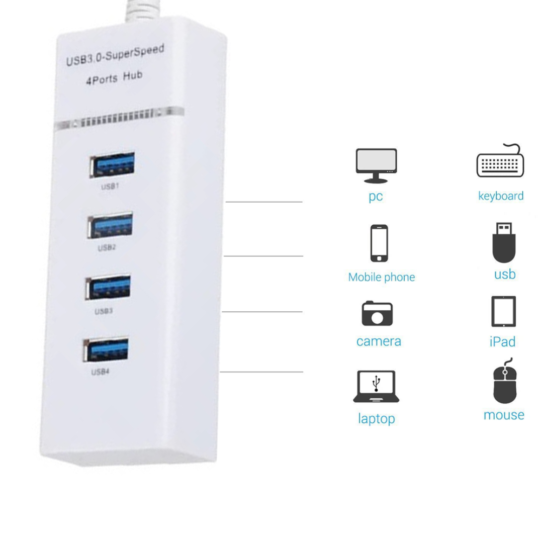 El HUB USB 3.0 de 4 Puertos es la solución perfecta para quienes necesitan expandir la conectividad de su PC, laptop o cualquier dispositivo compatible. Con una velocidad de transferencia de hasta 5 Gbps, permite la transmisión rápida de datos entre dispositivos sin pérdida de rendimiento.