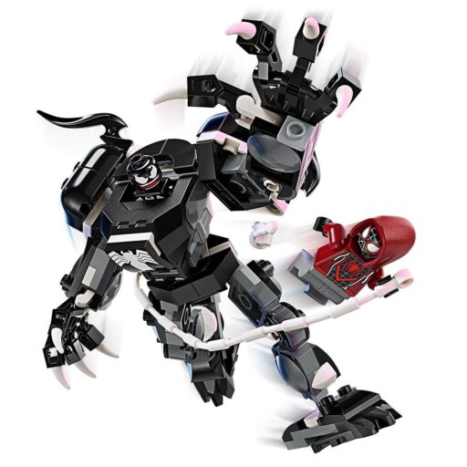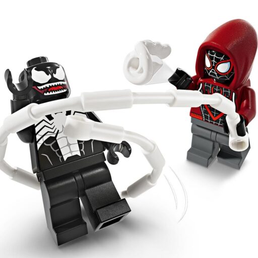 - Armadura articulada y minifiguras: Incluye una armadura robótica construible con brazos, piernas y dedos articulados, así como minifiguras LEGO® de Miles Morales y Venom.