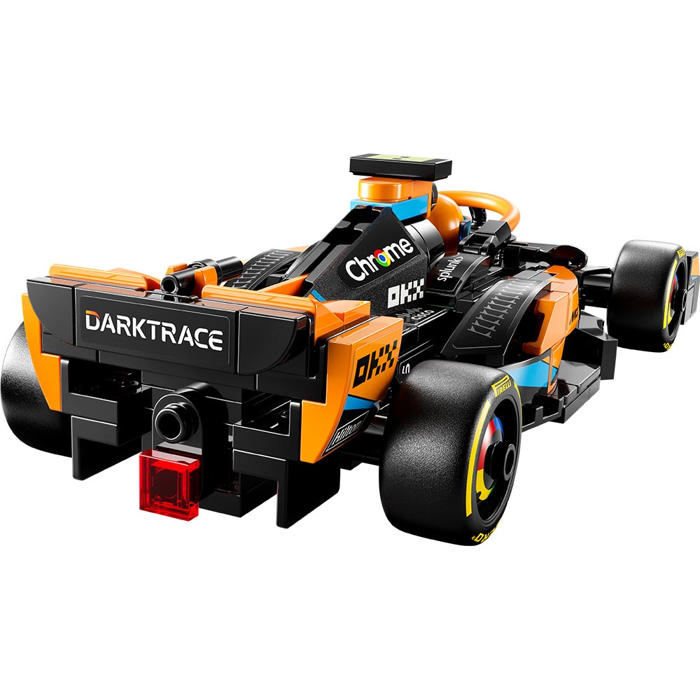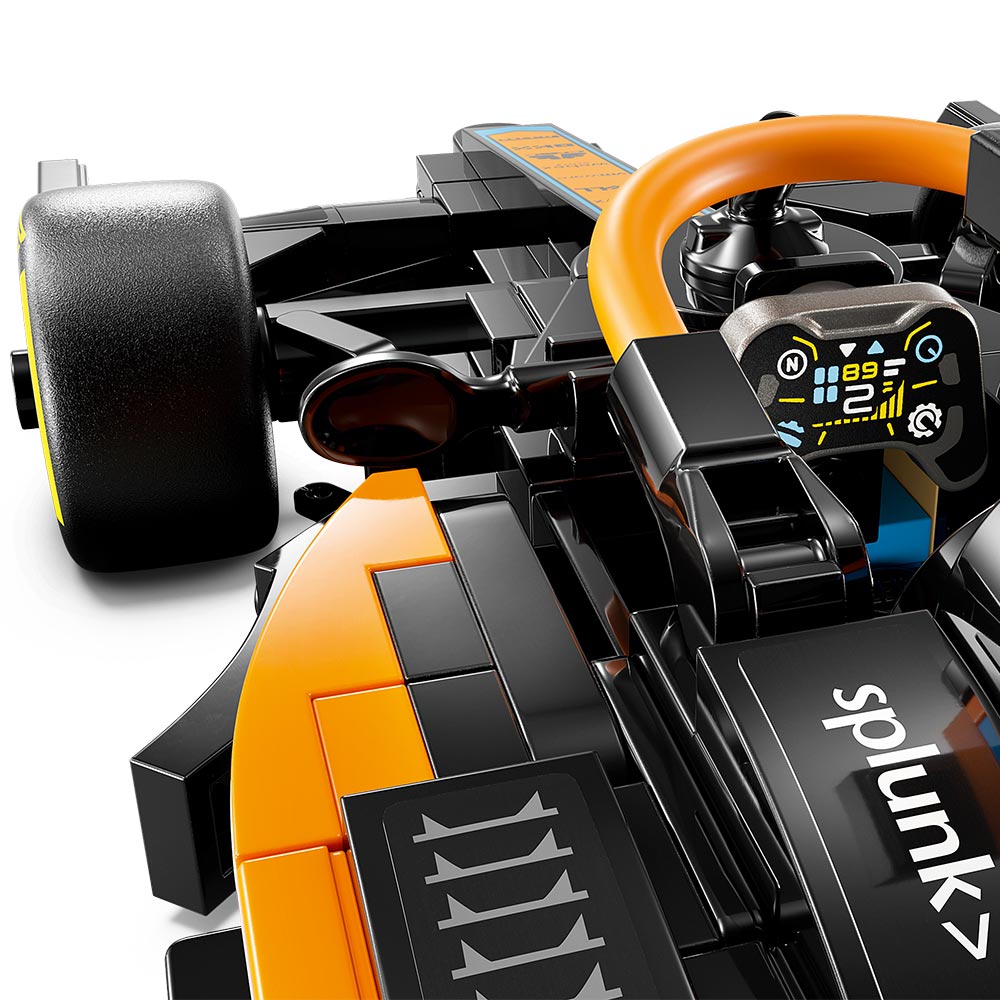 El modelo del vehículo McLaren incluye numerosas características de gran realismo: los colores distintivos negro y papaya, los logotipos de los patrocinadores del equipo, las ruedas con el nombre de Pirelli y el halo de seguridad papaya. El auto de este kit construible viene con una minifigura de un piloto.