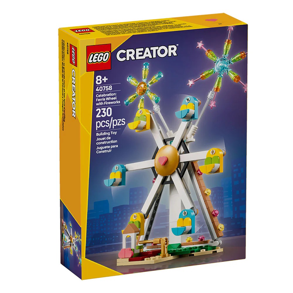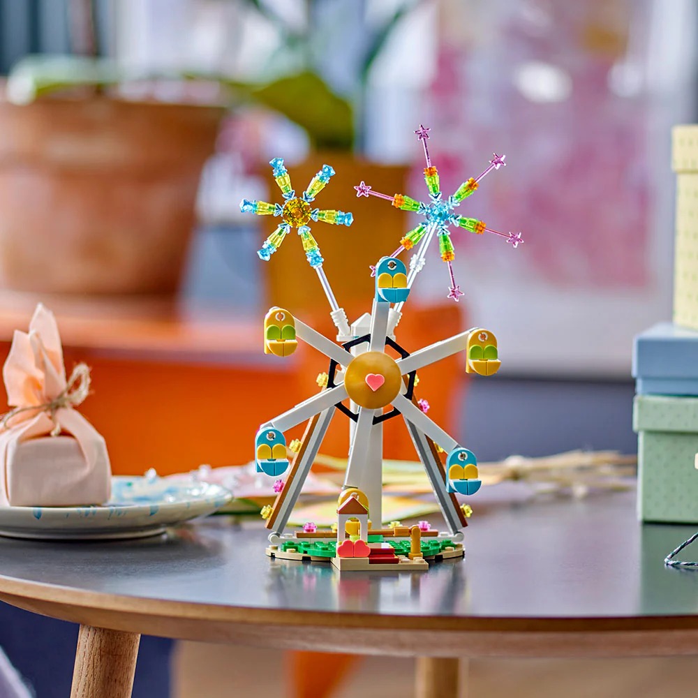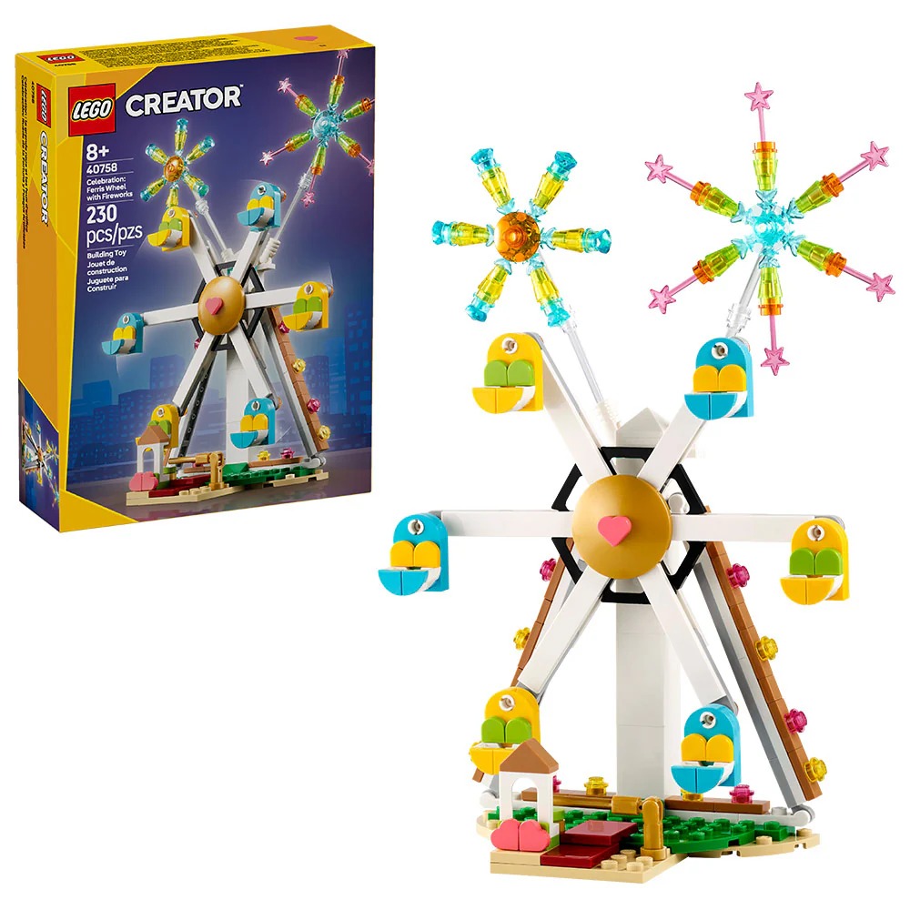 • Parque de atracciones de juguete: Celebra cualquier ocasión especial con el set de construcción LEGO® Creator Celebración: Rueda de la Fortuna y Fuegos Artificiales (40758).