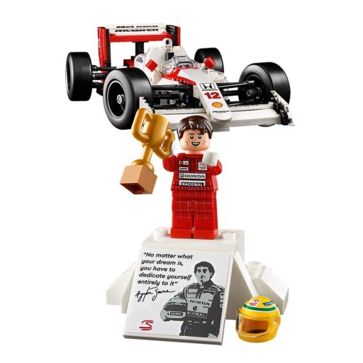 • Decorativa pieza de escritorio para el hogar o la oficina: La base de exposición del McLaren MP4/4 lleva impresos datos estadísticos del vehículo y la base para la minifigura de Ayrton Senna, similar a un podio, tiene una foto y una cita del piloto.