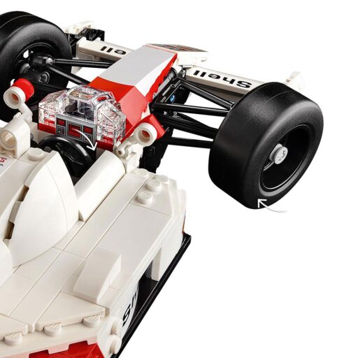La réplica del McLaren MP4/4 está equipada con mecanismo de dirección, suspensión por tirantes, alerón trasero ajustable, neumáticos lisos, espejos, palanca de cambios y detallado motor V6 turbo alimentado, y viene con una base de exposición y una placa con interesantes estadísticas. La minifigura de Ayrton Senna trae una base tipo podio y una placa con una cita y una foto del piloto.