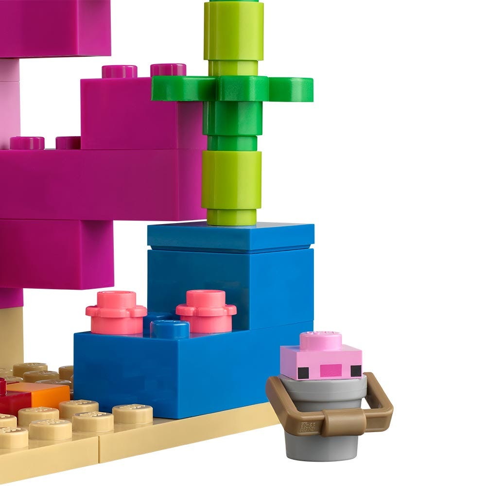 Los niños usan sus habilidades Minecraft para construir una enorme casa de brillantes colores con la forma del popular ajolote del juego. Después, acompañan a un Buceador Explorador en infinitas aventuras con un delfín busca tesoros, un pez globo, 2 ajolotes adultos, un ajolote en un cubo y un cofre del tesoro hundido. Luego pueden quitar el techo de la casa para acceder al interior amueblado, donde hay un horno de fundición y una esponja para las fugas de agua. Pero cuando ataque el zombi ahogado, los jugadores tendrán que coger una espada y ayudar a los ajolotes a defender su base de las profundidades marinas.