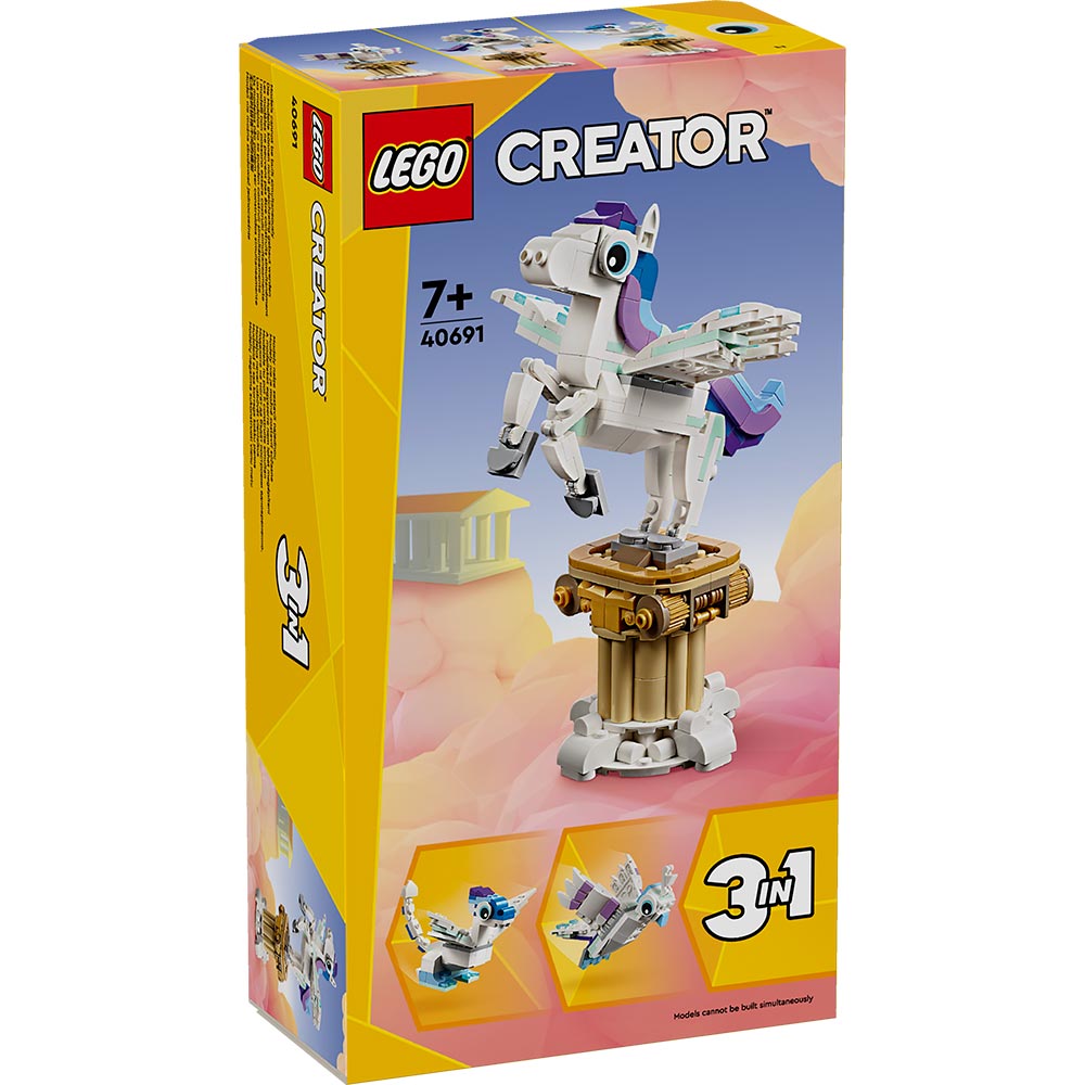 Los niños creativos de 7 años o más podrán viajar a un mundo de magia y fantasía para interpretar divertidas historias con el juguete 3en1 Pegaso Mítico (40691). Este caballo alado super encantador cuenta con patas, alas, cabeza y cola articuladas, y puedes apoyarlo sobre las 4 patas o colocarlo sobre las traseras en el pedestal. Después, los peques pueden elegir entre convertirlo en un dragón mítico de juguete con alas y cola articuladas o transformarlo en un pájaro mítico con las alas desplegadas, listo para volar. Cada modelo puede exponerse también en un magnífico pedestal de estilo griego clásico.