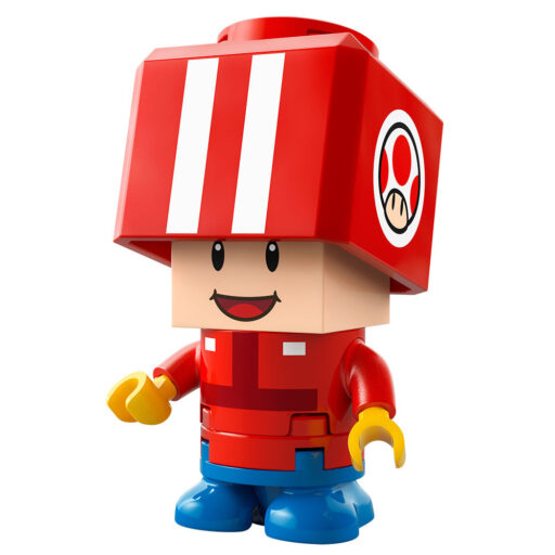 - Figura de juguete de Toad (boxes): Este juego LEGO® de aventuras para construir, basado en Mario Kart™, incluye una figura de Toad (boxes) con uniforme de boxes rojo, así como un elemento que representa un plátano, decorado con una cara.