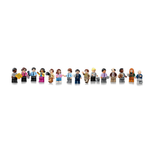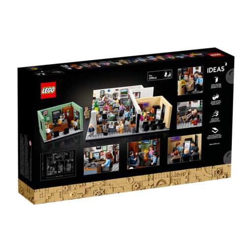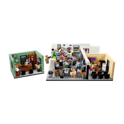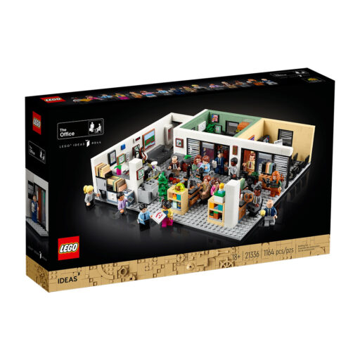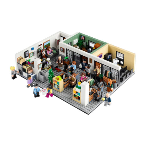 El set incluye 15 minifiguras LEGO: Michael Scott, Dwight Schrute, Jim Halpert, Pam Beesly, Ryan Howard, Angela Martin, Oscar Martinez, Kevin Malone, Stanley Hudson, Kelly Kapoor, Phyllis Lapin Vance, Meredith Palmer, Creed Bratton, Toby Flenderson y Darryl Philbin, además de una figura LEGO de Basura, el gato de Angela. Contiene también montones de accesorios alusivos a divertidísimos momentos, como una grapadora en gelatina, un cupón dorado, un premio Dundie y la taza con la frase “World’s Best Boss”.