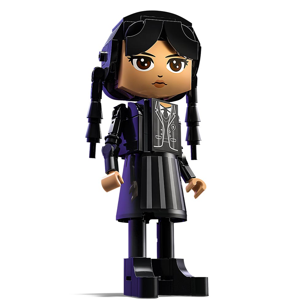 - Juguete inspirado en la Academia Nunca Más: Los fans de la serie para televisión a partir de 10 años podrán construir a Merlina con su uniforme o reconstruirla con el vestido que llevó al baile Rave’N, y luego colocarla en la base.