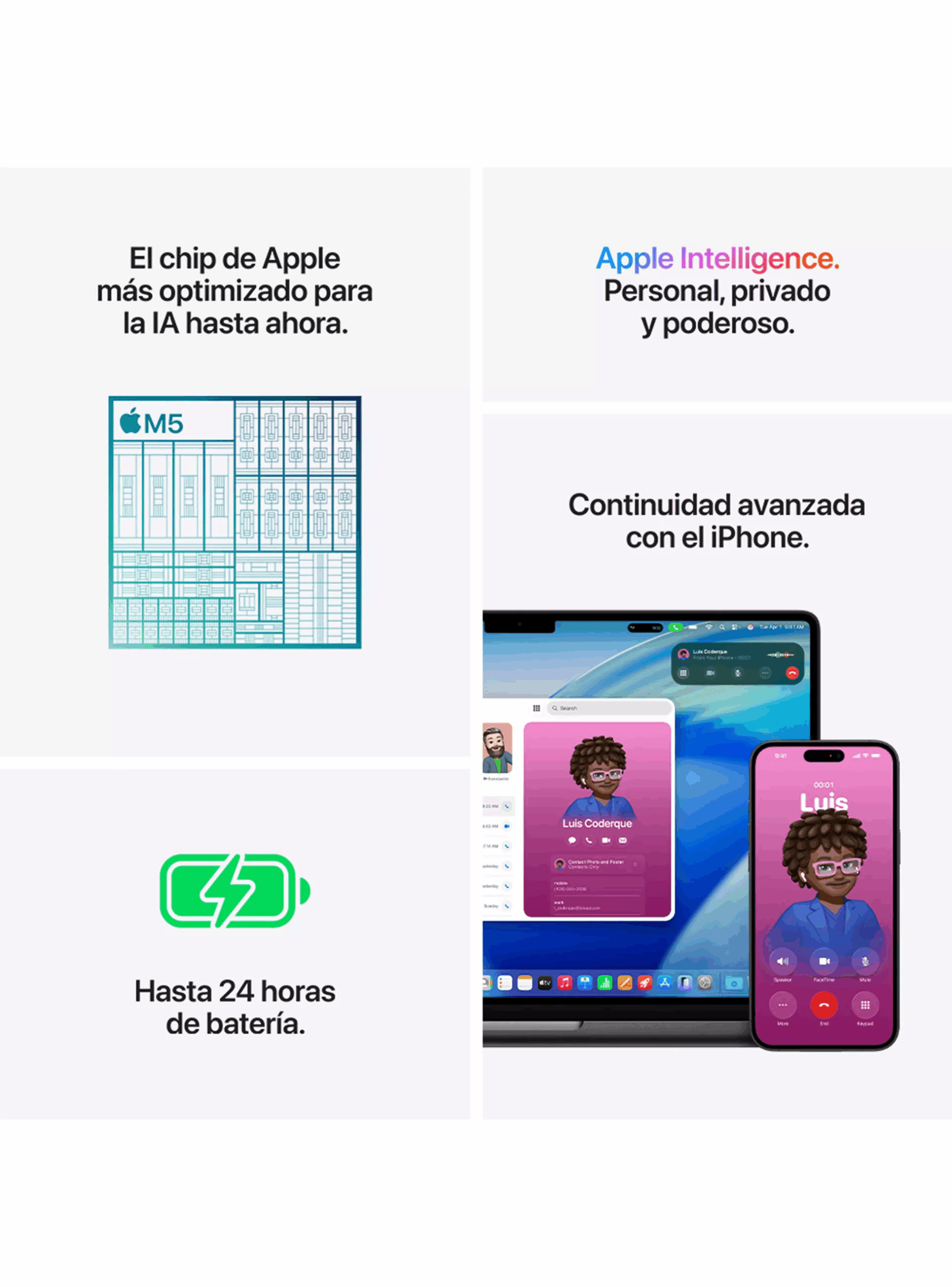 • DISEÑADO PARA APPLE INTELLIGENCE — Apple Intelligence es un sistema de inteligencia personal que te ayuda a escribir, expresarte y hacer de todo con mucha facilidad. Y sus avanzadas protecciones de privacidad te dan la tranquilidad de saber que nadie más podrá acceder a tus datos. Ni siquiera Apple.²