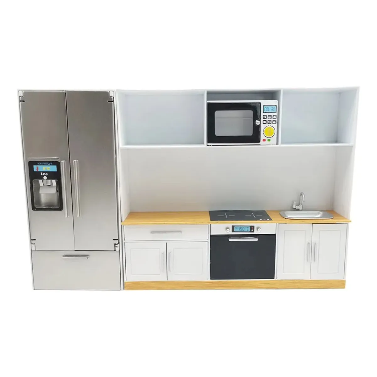 - Cocina en miniatura con horno, microondas, refrigerador, congelador y dispensador de hielo.