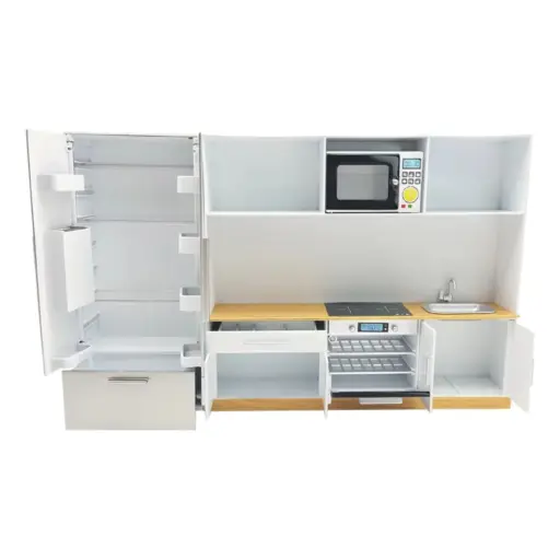 El Playset Cocina. ofrece una experiencia de juego simbólico en miniatura. Es ideal para pequeños chef’s que disfrutan recrear escenas cotidianas y fomentar su creatividad y habilidades motrices. El conjunto incluye electrodomésticos detallados y accesorios para personalizar el espacio de juego. Compatible con otras figuras y sets de la misma línea.