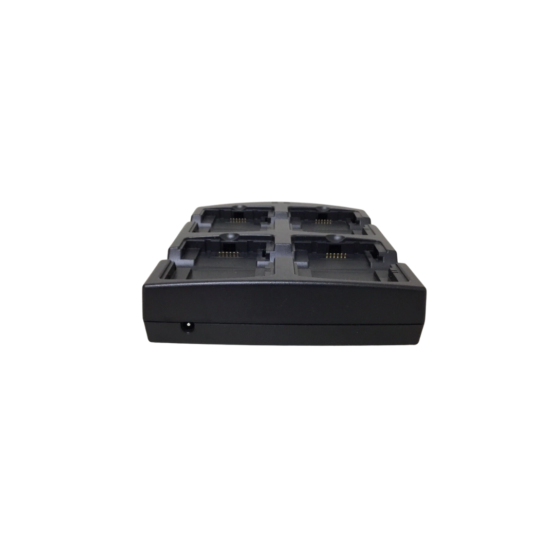 Cuna de carga de cuatro ranuras diseñada para la recarga simultánea de baterías en entornos profesionales. Este cargador permite mantener varias baterías listas para su uso, optimizando la continuidad operativa en aplicaciones como logística, retail, manufactura y bodegas. Es compatible con baterías estándar y de alta capacidad, y requiere fuente de alimentación externa y cable de energía específicos. Se trata de una solución confiable para estaciones de carga centralizadas en operaciones de alta demanda.