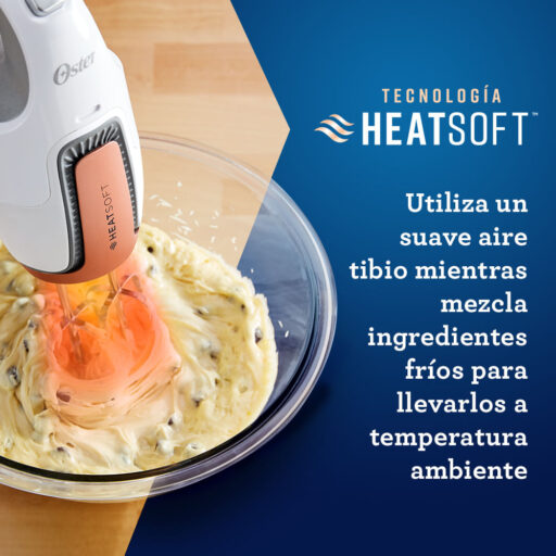 Ya no tienes que esperar a que tus ingredientes lleguen a la temperatura ambiente deseada antes de hornear tus tortas, pies, galletitas y merengues. La batidora de mano Oster® con tecnología HEATSOFT™ utiliza un ligero aire caliente para suavizar los ingredientes fríos mientras estás batiendo, de manera que puedes hornear, con resultados más esponjosos, suaves y cremosos, comparado con mezclar con ingredientes fríos para llevarlos a temperatura ambiente.