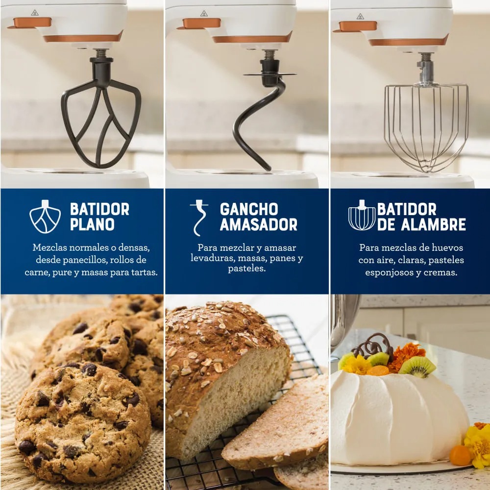 • El tazón de 5,2 L y batidor de borde flexible aseguran mezclas consistentes llegando a las paredes del recipiente.