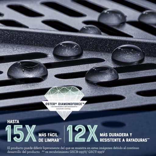 Recomendación: Aunque no es necesario cocinar el recubrimiento DiamondForce, sugerimos que antes de usar por primera vez tu producto Oster® con recubrimiento DiamondForce, laves la canasta de cocción y la bandeja de freír con aire con agua caliente y jabonosa. Enjuagues y luego seques todas las partes. Cubre ligeramente toda la superficie de cocción, incluida la rejilla de cocción, con aceite de cocina. Enciende el aparato y caliéntalo hasta que alcance el máximo calor. Apaga y enfría por completo. Limpia el aceite en exceso con agua caliente sin frotar. Seca la superficie con un paño seco. Ahora la freidora de aire está lista para ser usada.