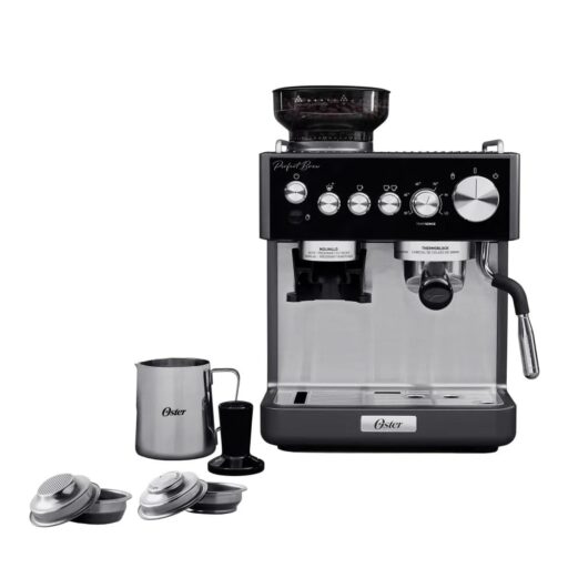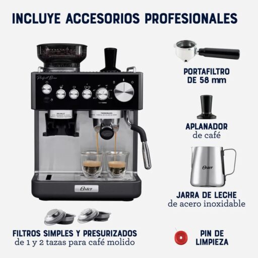 La cafetera espresso Oster Perfect Brew te ofrece la calidad de una cafetería en casa, en solo tres pasos. Primero, muele tus granos de café con el molinillo cónico de muelas que cuenta con 30 configuraciones, asegurando una molienda perfecta y sin derrames gracias a su tecnología antiestática, que hace que el café molido caiga directamente en el porta filtro. Luego, extrae un espresso sencillo o doble con un solo botón, mientras su porta filtro comercial de 58 mm garantiza una mejor extracción y un sabor más intenso. Finalmente, texturiza la leche para obtener una micro espuma suave con el tubo de vapor Tempsense™, ideal para lattes y capuchinos cremosos. Con su botón de fácil limpieza y accesorios profesionales, como filtros, jarra de leche y prensador de café, tendrás todo lo necesario para disfrutar de un café perfecto en casa.