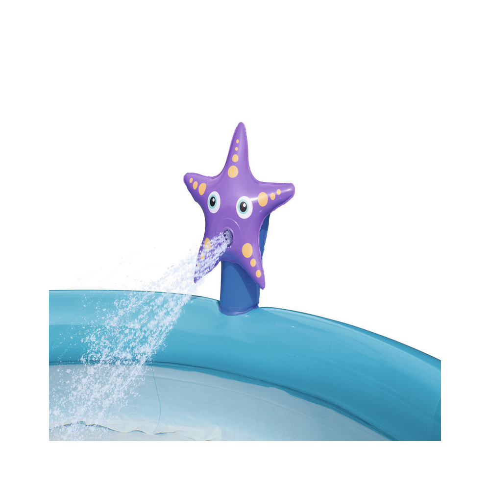 Alberca inflable Bestway con diseño de peces en color azul cielo. Fabricada en plástico PVC resistente, tiene capacidad de 477 L y está recomendada para niños a partir de 3 años. Incorpora un rociador en forma de estrella de mar para añadir diversión en los días de calor. Su forma circular permite instalarla fácilmente en patios, garajes o jardines. Se recomienda usar una sábana protectora bajo la alberca para evitar daño en el piso y seguir el manual de instrucciones.