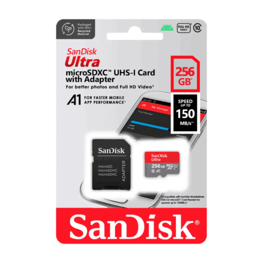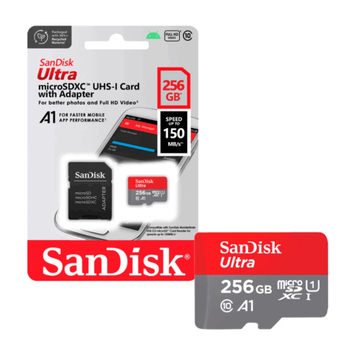 La tarjeta SanDisk Ultra microSDXC de 256 GB ofrece amplio almacenamiento y excelente velocidad de lectura, ideal para guardar fotos, videos Full HD y ampliar la memoria de smartphones, tablets o consolas. Con certificación A1, mejora el rendimiento de las aplicaciones. Viene con adaptador SD para uso en otros dispositivos y cuenta con una duradera garantía de 10 años.