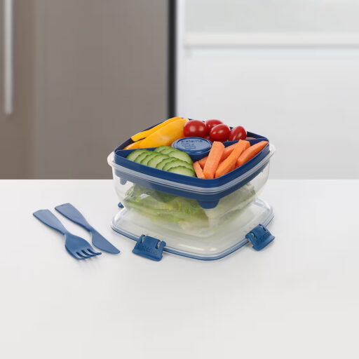 - Incluye compartimento hermético para aderezos, un cuchillo y un tenedor que se enganchan a la tapa.