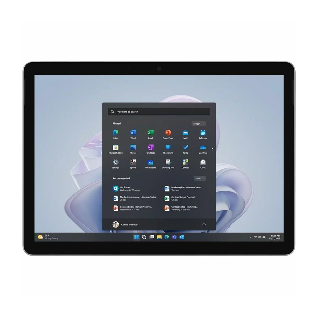 Su resistente pantalla táctil PixelSense de 10,5″ y 10 puntos de contacto admite una resolución de 1920 x 1280 con una relación de aspecto de 3:2 que proporciona más espacio de pantalla vertical para documentos, fotos, películas, juegos y más, mientras que el soporte ajustable integrado te permite ver el contenido cómodamente. Surface Go 4 está optimizado tanto para el control de la pantalla táctil como del lápiz óptico (como el Surface Pen opcional), pero también puedes colocar una funda con teclado comprada por separado o simplemente emitir comandos de voz. La cámara frontal y la cámara trasera de 8 MP te permiten grabar vídeos Full HD 1080p, así como participar en videochats. Windows 11 Pro es el sistema operativo instalado.