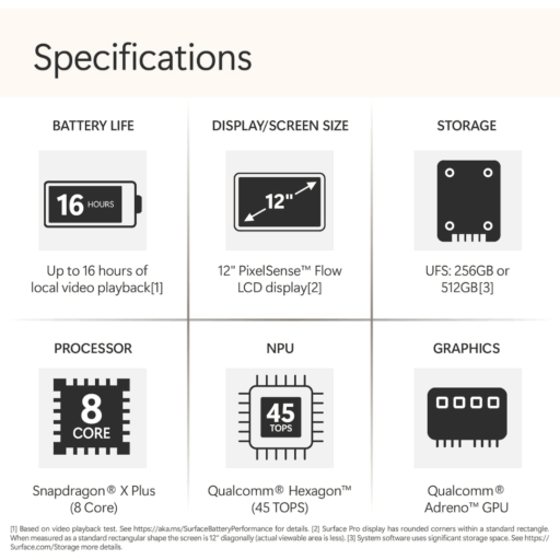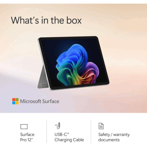 La era de las PC Copilot+ ha comenzado, y todo empieza con la Surface Pro Copilot+ de 12″ de Microsoft . Optimizada para aprovechar al máximo Microsoft Copilot, la Surface Pro cuenta con el procesador Snapdragon X Plus de 8 núcleos. Gracias a la NPU Qualcomm Hexagon integrada, la Surface Pro puede gestionar hasta 45 TOPS, lo que permite una integración perfecta de la IA en Windows 11. Añádele una pantalla táctil LCD PixelSense de 12″, 16 GB de RAM, 256 GB de almacenamiento UFS, Wi-Fi 7, Bluetooth 5.4, dos puertos USB-C y más, y la Surface Pro está lista para gestionar tu flujo de trabajo con facilidad. La Surface Pro también es compatible con los teclados Surface opcionales y el Surface Slim Pen para una mayor versatilidad. Ten en cuenta que esta Surface Pro no incluye cargador.