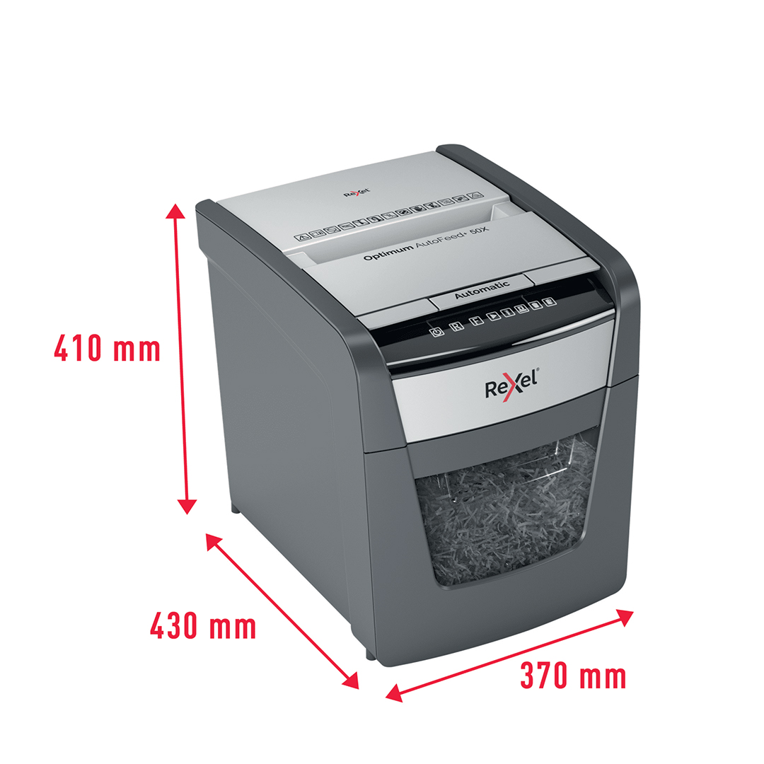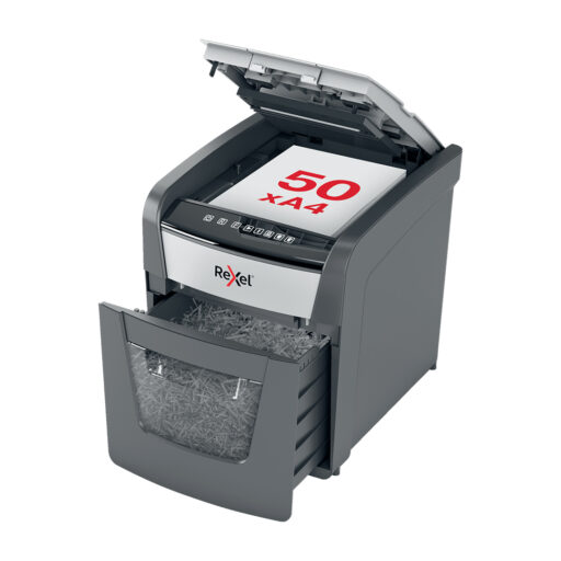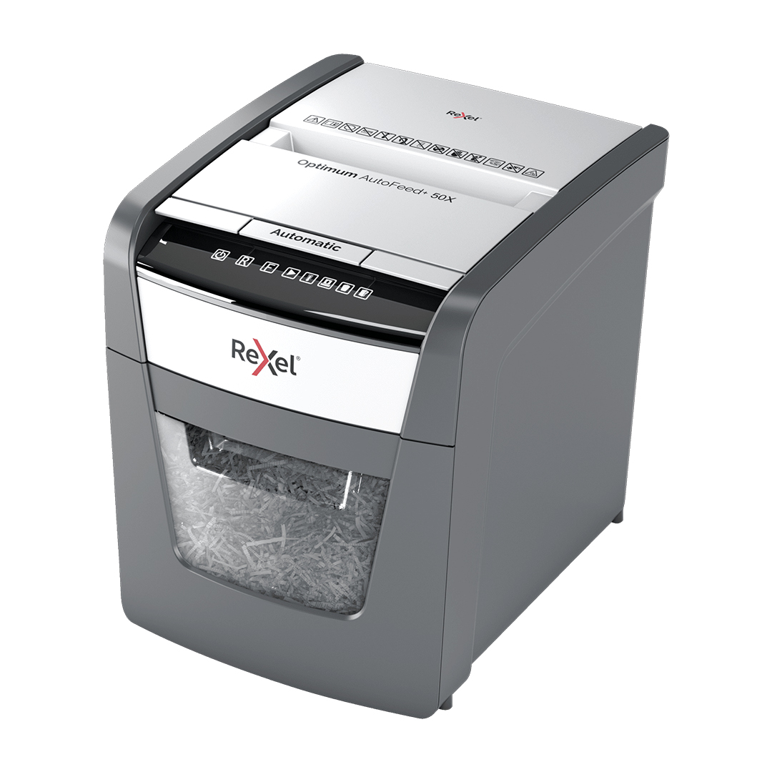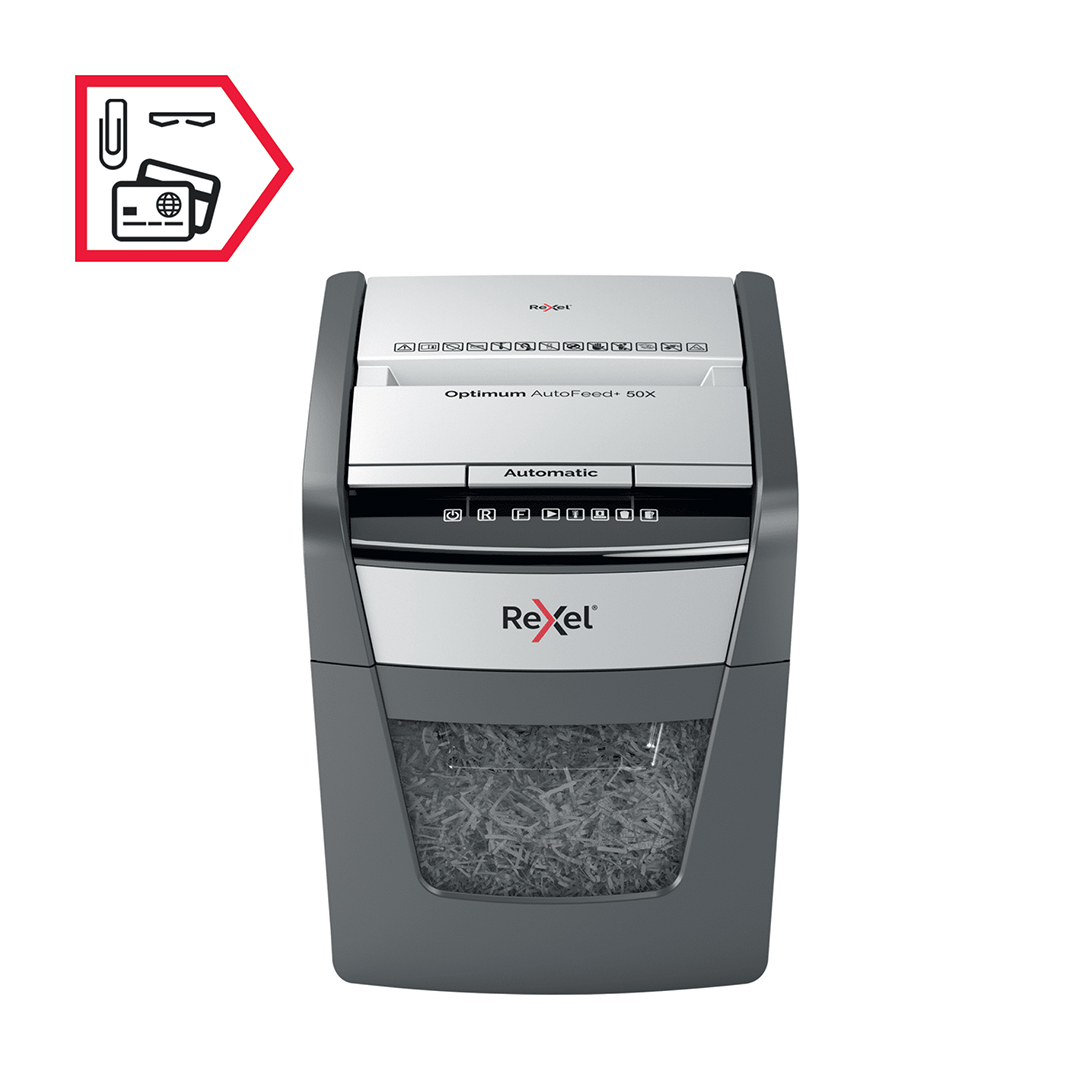 La destructora automática Rexel Optimum AutoFeed 50X es ideal para pequeñas oficinas o para el uso personal en el hogar, ofreciendo seguridad y eficiencia en la destrucción de documentos. Con su tecnología AutoFeed, permite destruir automáticamente hasta 50 hojas de papel (80 g/m²) en corte de partículas, brindando un alto nivel de seguridad y privacidad. Además, puede triturar tarjetas de crédito y grapas, lo que facilita la eliminación de materiales sin necesidad de preocuparse por retirarlas manualmente. Su diseño compacto la convierte en una herramienta conveniente y eficiente para el espacio de trabajo.