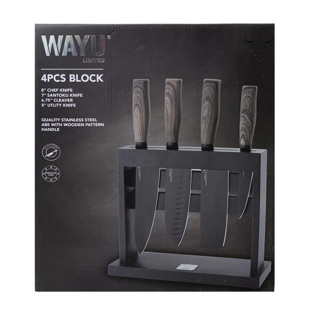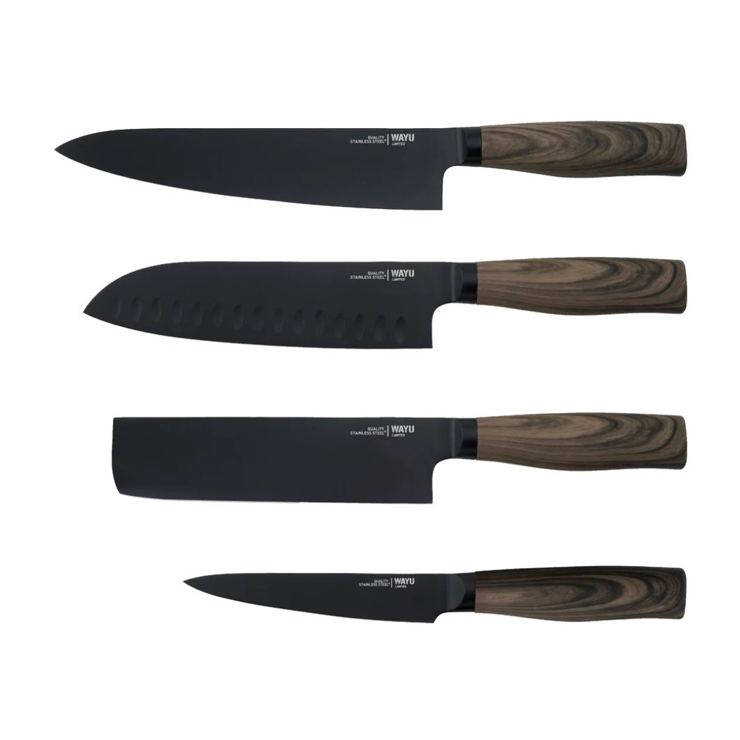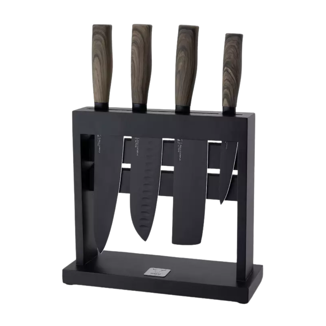El Taco 4 Piezas Wayu es un set práctico y sofisticado que reúne lo esencial para tu cocina. Cada cuchillo está fabricado en acero inoxidable de alta calidad, ofreciendo resistencia y un filo preciso para diferentes tipos de cortes. Su diseño en tonos negro y café aporta modernidad, mientras que el taco organizador mantiene las piezas siempre a mano y tu espacio ordenado. Perfecto para quienes buscan funcionalidad y estilo en un solo producto.