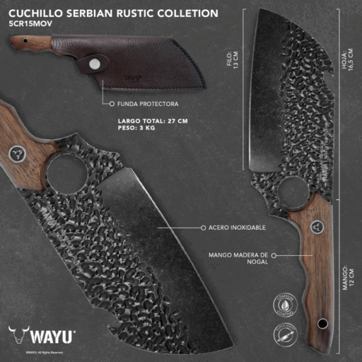 ElCuchillo Serbian Con Funda Rustic Collection Wayues una herramienta de cocina ideal para quienes buscan un cuchillo versátil y duradero. Parte de la exclusiva Rustic Collection, este cuchillo combina un diseño tradicional serbio con una funda protectora, ofreciendo tanto funcionalidad como estilo.